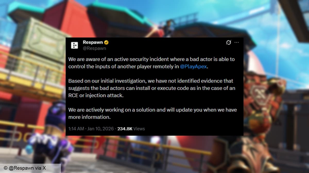 Late on January 9 Respawn posted: “We are aware of an active security incident where a bad actor is able to control the inputs of another player remotely in Apex Legends. Based on our initial investigation, we have not identified evidence that suggests the bad actors can install or execute code as in the case of an RCE or injection attack. We are actively working on a solution and will update you when we have more information.”