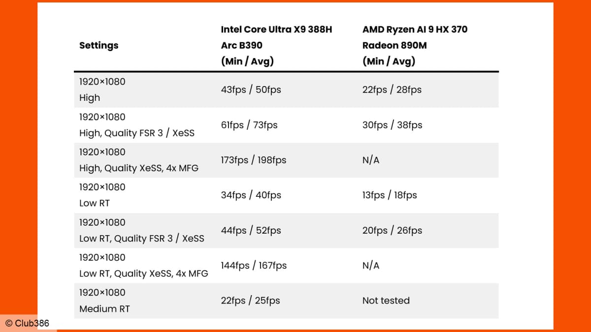 Club386 compared a Lenovo laptop with an Intel Core Ultra X9 388H against an Asus Vivobook S with an AMD Ryzen AI 9 HX 370. In Cyberpunk 2077 at 1080p on the high preset, Intel posted about a 50fps average with 43fps 1% lows while the AMD system managed 28fps average and 22fps 1% lows. Intel’s claim of a ~73% GPU uplift versus AMD’s Radeon 890M is backed up — Club386’s hands-on showed up to ~78% better frame rates in some tests.