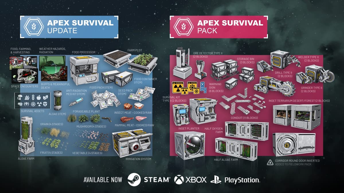 I’ve sunk an embarrassing number of hours into Space Engineers, and as much as I love bolting thrusters to ill-advised bricks, its “survival” has always felt more like engineering on hard mode than an actual survival loop. The new Apex Survival update changes that in a way that finally gives the day-to-day grind real stakes: food and farming, hunting, environmental hazards, a new respawn and buff system, and a slate of handcrafted Random Encounters (30 of them) to stumble across between ore veins. It’s live now on PC (Steam), Xbox, and PlayStation – and importantly, the deep mechanics are free. A small paid DLC adds decorative grow-space blocks for base flair.