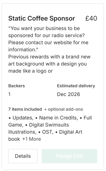 About the Kickstarter itself: the relaunch is “funded” at $1,050 with 45 backers and 27 days to go at time of announcement. Reward tiers range from simple credits to artbook and OST, up to premium offerings like a two-sided dakimakura featuring Hayley and Gracie. Higher tiers let backers insert an original character into the world (cameos with voice lines) or even headline a dedicated chapter. That last part will get fans buzzing—and developers sweating—because custom content is notoriously hard to schedule without disrupting the main routes.