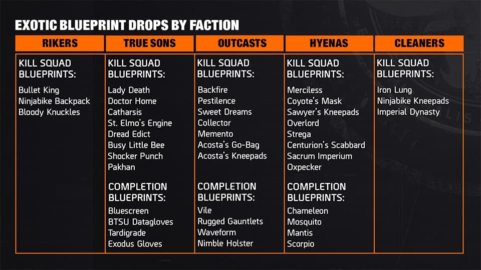 Here’s the big quality-of-life win: most exotic gear blueprints now belong to specific factions. Hunt Hyenas, True Sons, Outcasts, Cleaners, or Rikers to chase what you need, and expect drops both from kill squads and for completing a Retaliation zone. That’s miles better than praying to the RNG gods after another dozen heroic control points.