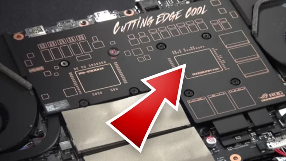 So you end up with a big, flat vapor chamber covering the GPU die and memory, feeding heat into a long heatsink. The laptop world is basically lifting that idea and smashing it into a thinner, even more constrained form factor.