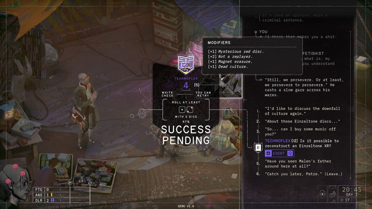 Mechanically, the demo leans into what made Disco Elysium feel alive: skills that interrupt conversations and argue like their own NPCs, frequent checks that steer scenes into different beats, and consequences that aren’t just skill-success versus failure but personality shifts. What pushes Zero Parades into its own lane are the Pressure bars — Fatigue, Anxiety, Delirium — plus rituals to manage them. Those give stealth and tradecraft a psychological cost, not just a numerical one.